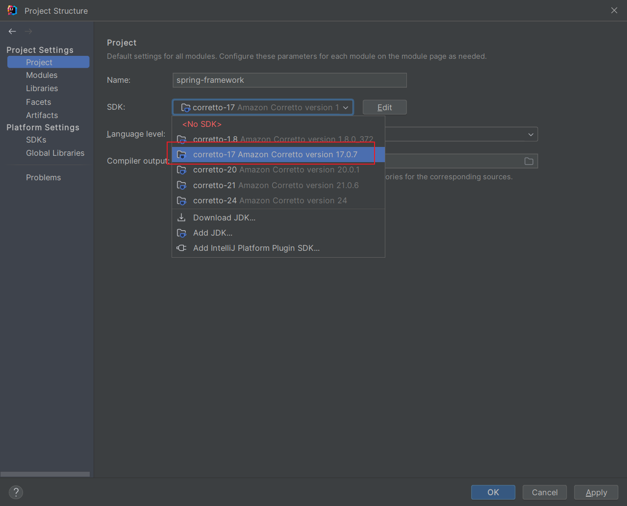 安装构建项目所需的JDK版本,这里我使用的是从IDEA中下载的JDK17(Amazon Corretto version 17.0.7)。