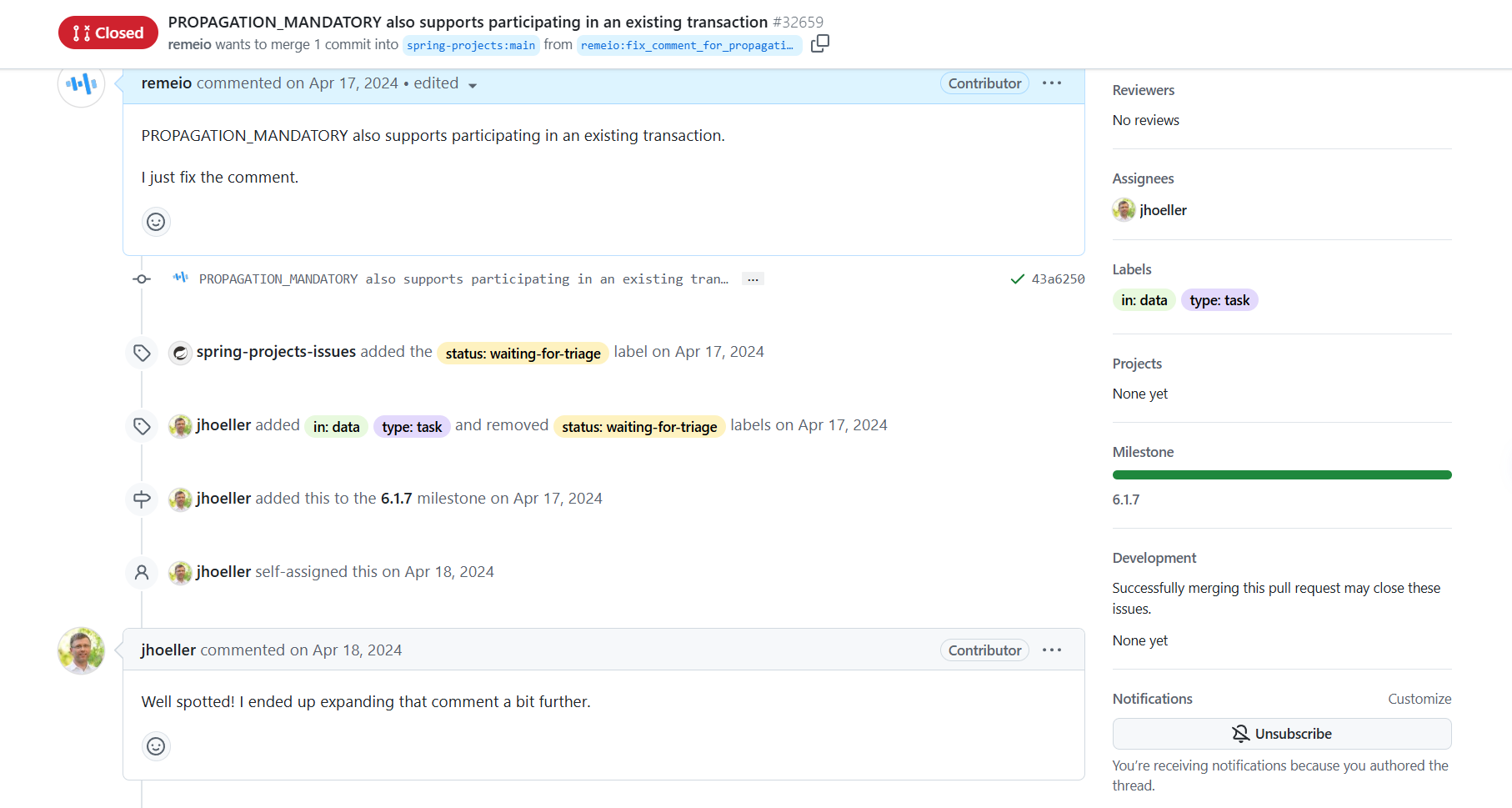 在阅读Spring Framework的事务相关的源码的时候,发现源码中注释写的不太正确(遗漏了一种情况),便提交了一个PR[3],